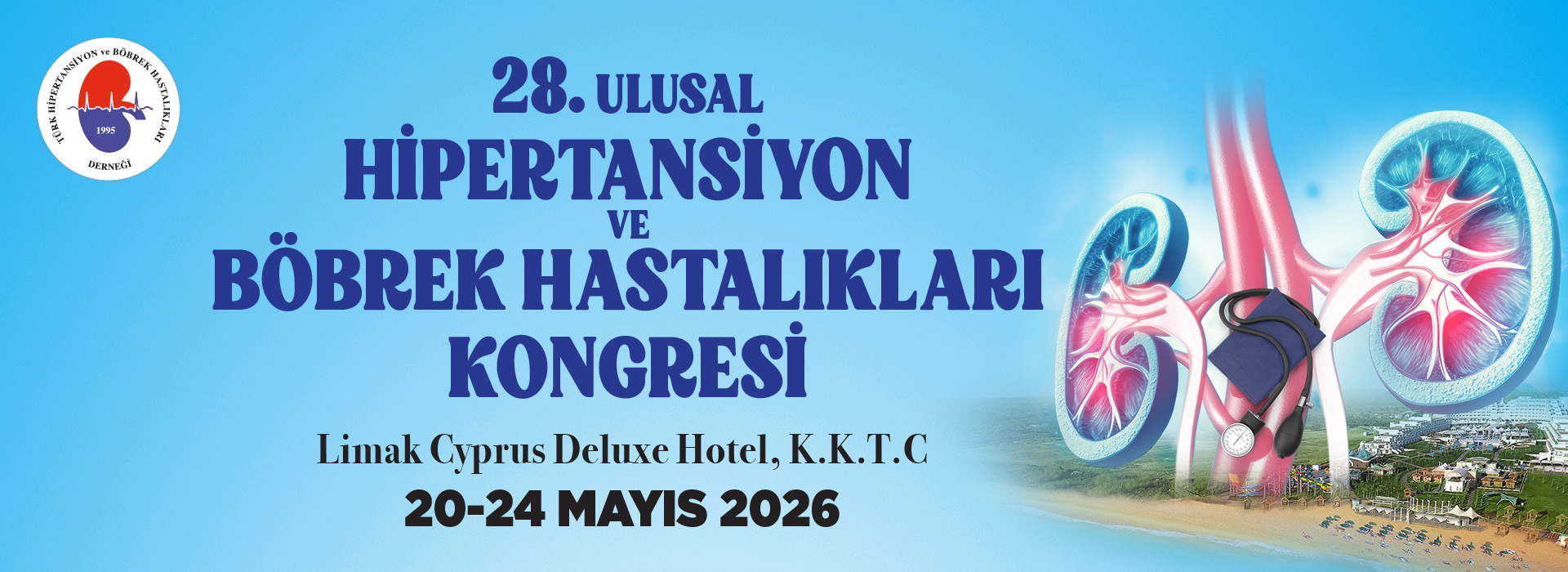 Türk Hipertansiyon ve Böbrek Hastalıkları Derneği olarak bu yıl 28. Ulusal Hipertansiyon ve Böbrek Hastalıkları Kongresi’ni 20 Mayıs – 24 Mayıs 2026 tarihleri arasında Limak Cyprus Deluxe Hotel, K.K.T.C de gerçekleştireceğiz. Her yıl hipertansiyon ve ilişkili hastalıklar başta olmak üzere, nefroloji klinik pratiği ve araştırma alanlarındaki güncellemeleri sizlere aktarmayı hedeflemiş derneğimiz bu yılda konferans, sempozyum, panel, sözlü ve poster sunumları oturumları ile geniş ve interaktif bir bilimsel programla sizlere aktaracaktır. Alanında önde gelen hocalarımızın sunumlarıyla klinik pratikte karşılaştıkları vakalar ile güncel literatürün harmanlandığı oturumlar planlanmıştır. 28. Kongremizde de her yıl olduğu gibi bildirileriniz bilimsel kurulumuz tarafından değerlendirilecek ve dereceye giren bildirilere başarı ödülleri verilecektir. Türk Hipertansiyon ve Böbrek Hastalıkları Derneği’nin ana misyonu genç meslektaşlarımız başta olmak üzere tüm Nefroloji, İç hastalıkları uzmanı ve diyaliz hekimlerimizin eğitimine hizmet olup bu çerçevede, derneğimiz tarafından belirlenen kontenjan kapsamında, kongremize bildirileri ile aktif katılım gösteren yan dal ve ana dal araştırma görevlisi doktor arkadaşlarımıza, kayıt, konaklama desteği vermeye devam edeceğiz.
